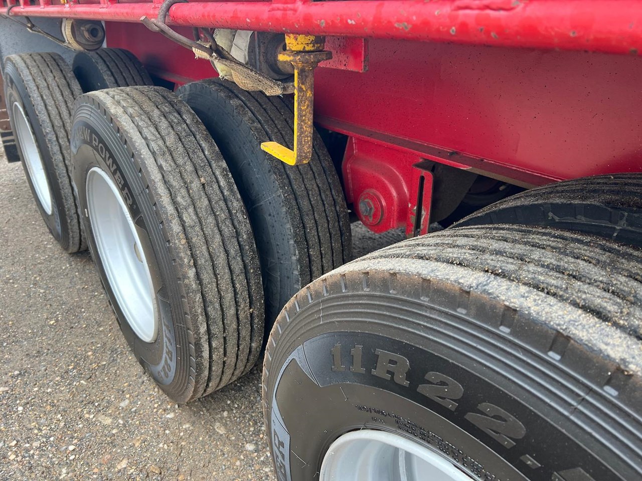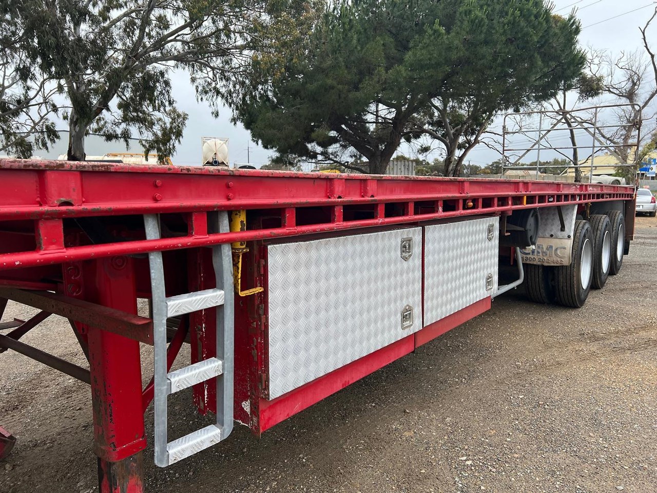 12/2012 CIMC 45" tri axle flat top trailer,KHitch axles on air bag susp,10 stud steel wheels,3 way container pins,Ringfeder fitted in rear with air and electric fittings,Load binders in track,Road Train flip signs,2 x toolboxes on LHS,Water tank,Full set of gates,Spreader bars,Bolt in 2" king pin,Led lights,Spare wheel carrier with spare wheel.