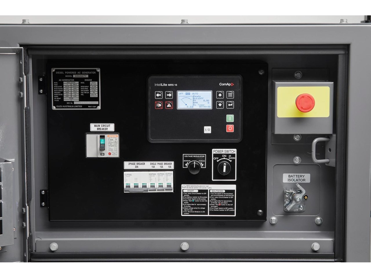 Emergency stop, adjustable voltage regulator, battery isolator