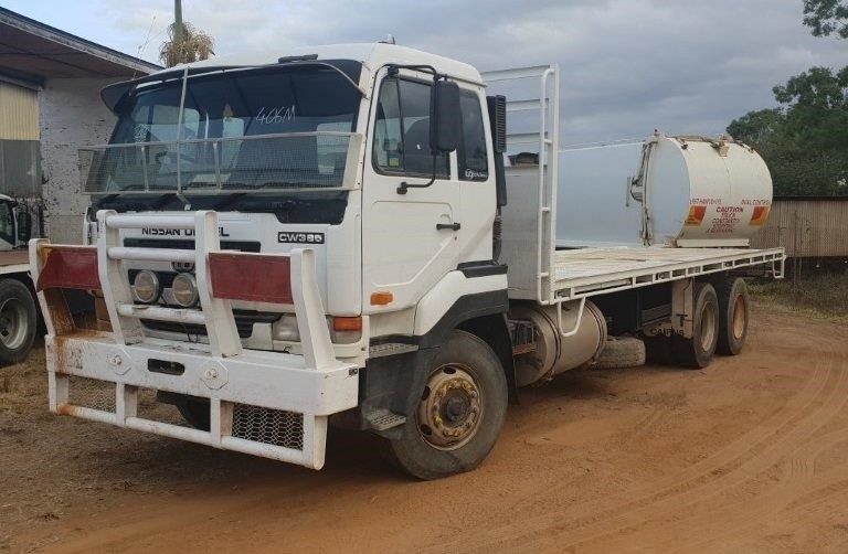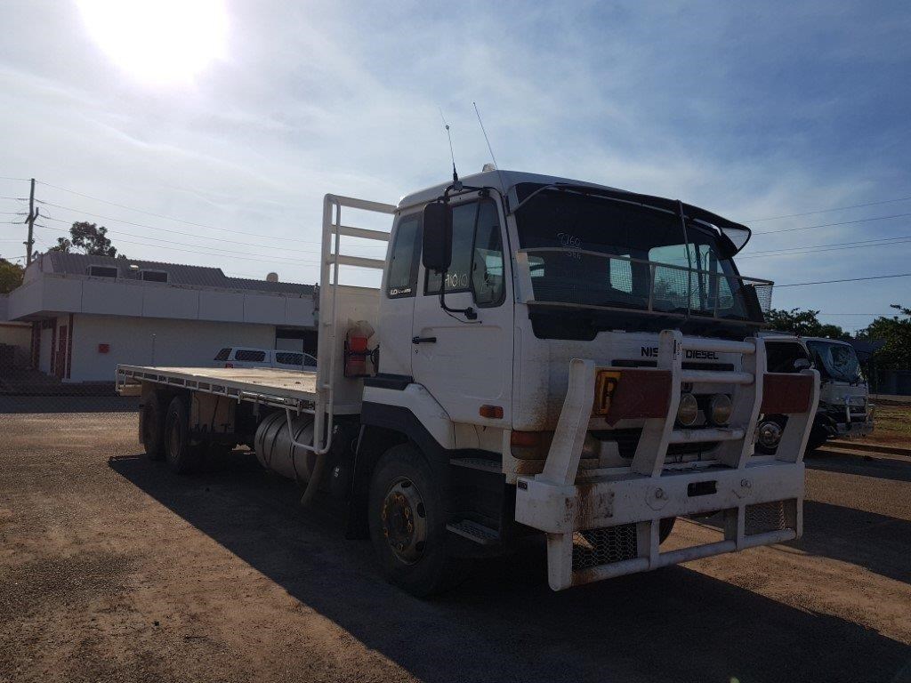 2005 Nissan UD CWB483 CW395 with excellent GE13 turbo diesel engine (sold) and Eaton 13 speed RTLO14913A gearbox. Also has springs; bullbar; aux lights; livestock loading ramp